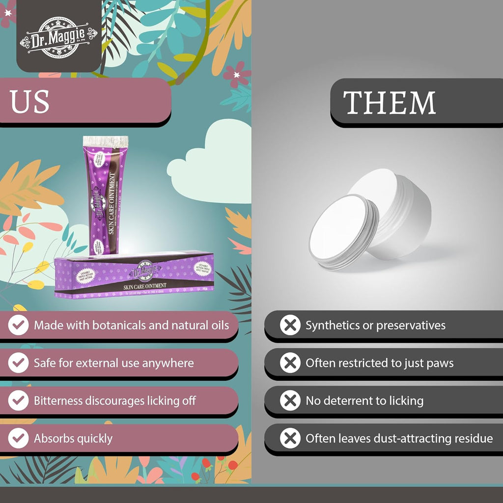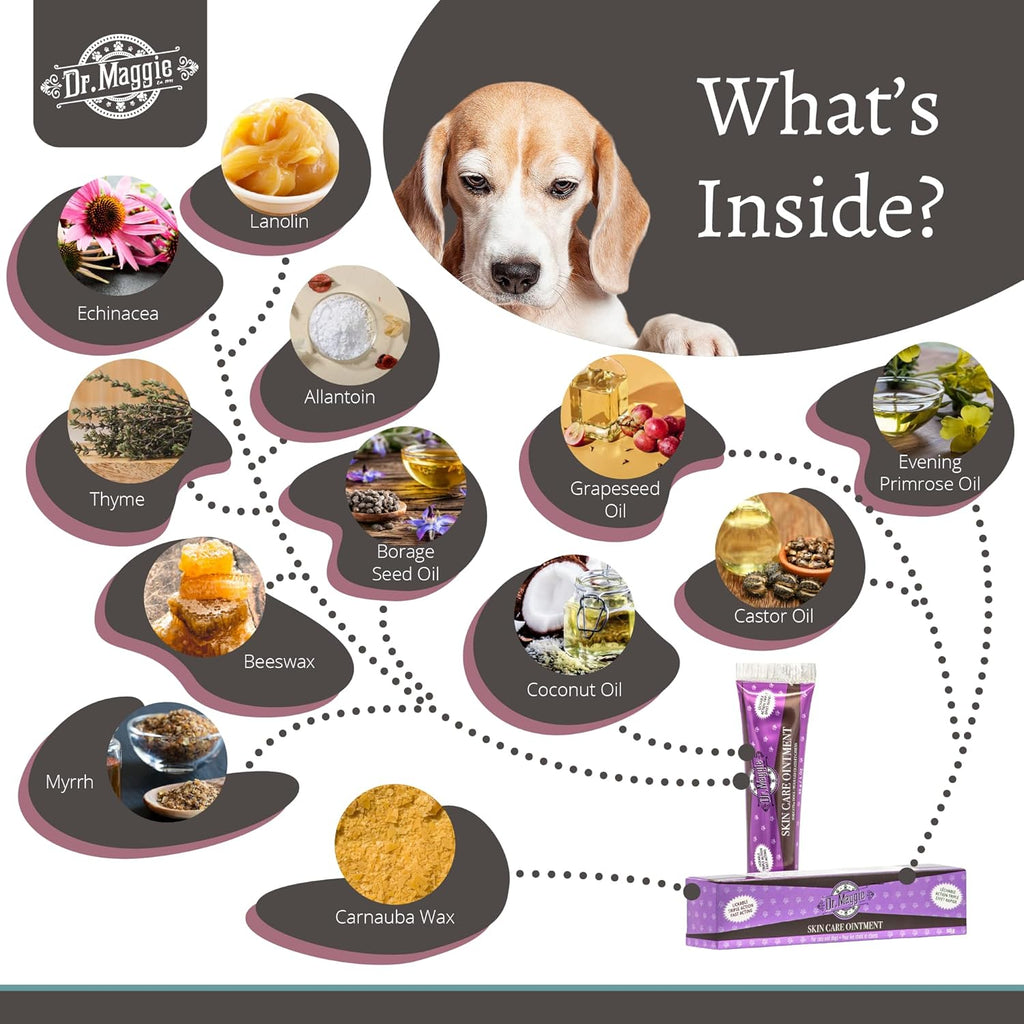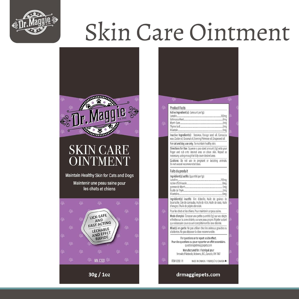 Dr. Maggie Skin Care Ointment is a topical formula that supports natural healing ability. Apply to wounds, scratches, insect bites and minor cuts for soothing effect. A bitter taste discourages licking.