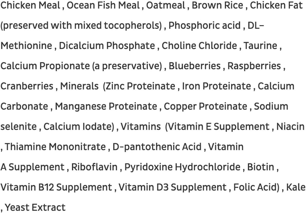 Chicken Meal Ocean Fish Meal Oatmeal Brown Rice Chicken Fat (Mixed Tocopherols) Phosphoric acid DL–Methionine Choline Chloride Dicalcium Phosphate Taurine Calcium Propionate Blueberries Raspberries Cranberries Minerals (Zinc Proteinate Iron Proteinate Calcium Carbonate Manganese Proteinate Copper Proteinate Sodium selenite Calcium Iodate) Vitamins (Vitamin E Supplement Niacin Thiamine mononitrate D-pantothenic Acid Vitamin A Supplement Riboflavin Pyridoxine Hydrochloride Biotin Vitamin B12 Supplement Vitamin D3 Supplement Folic Acid ) Kale Yeast Extract.