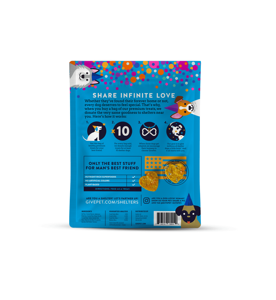 6oz bag of birthday-themed soft baked treats. Made with nutrient-rich whole foods and superfoods. Applesauce, rolled oats and honey flavor! A great birthday gift for your pup!