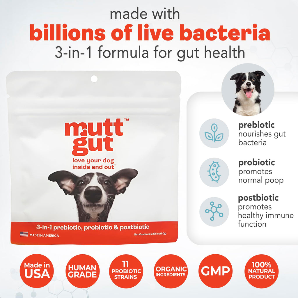 - SUPPORT YOUR DOG’S DIGESTION - Made with 200 billion CFUs, MuttGut 3-in-1 Prebiotic, Probiotic & Postbiotic Supplement Powder helps deliver good bacteria to the gut and promotes optimal nutritional absorption.
