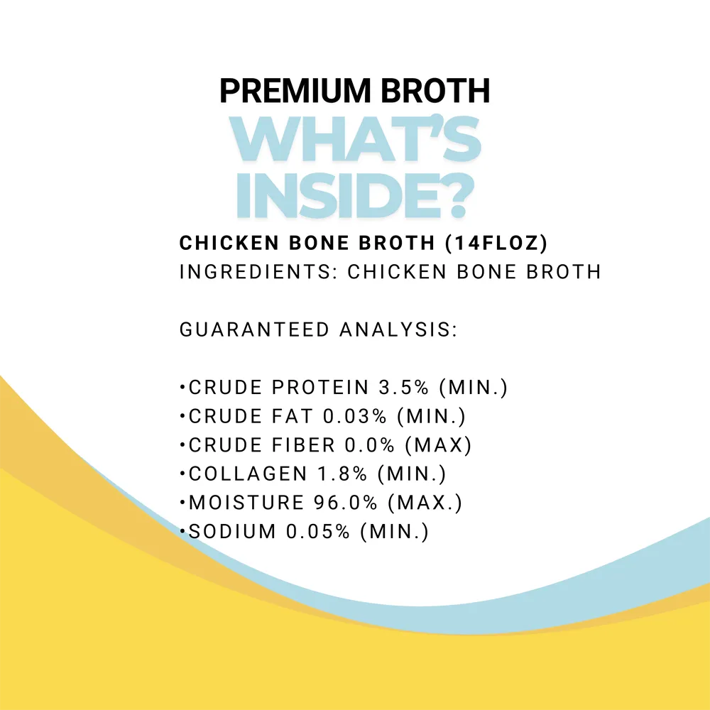 Not only does it make your dog's normal food fun and tasty, but it is also a good source of collagen which can help in promoting bone health and skin health. It is great for picky eaters as it provides an exciting aroma and additional taste that will have your dog finishing its food fast! Is your dog on a dry diet? Broth is great for hydration too. Do you feed your dog raw? Broth makes raw dog food more appealing to them because of the chicken smell, just add a little and watch them gobble it up!
