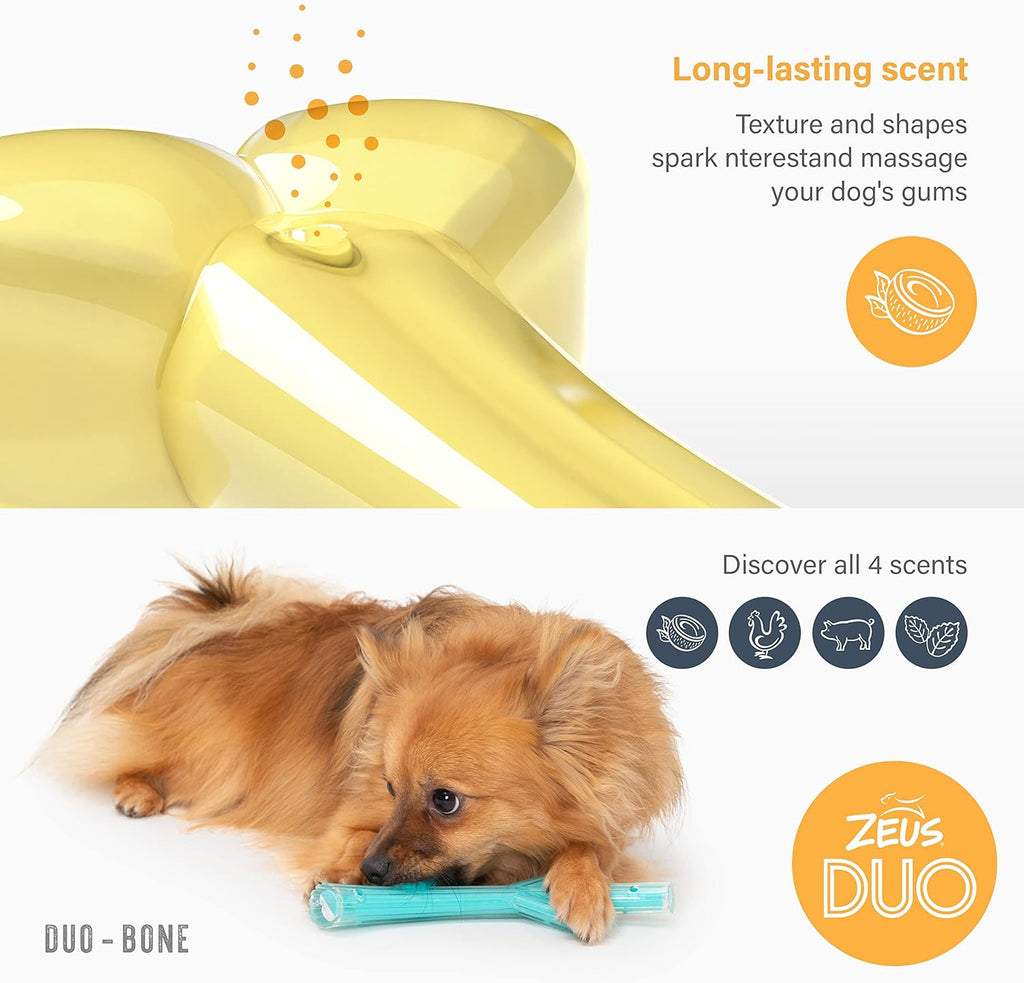 Zeus DUO chew toys have a unique, durable consistency for optimal chewing enjoyment by dogs, and are deliciously scented for extra appeal.