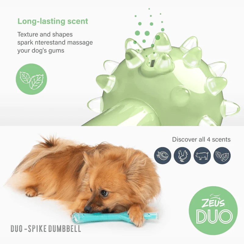 Zeus DUO chew toys have a unique, durable consistency for optimal chewing enjoyment by dogs, and are deliciously scented for extra appeal.