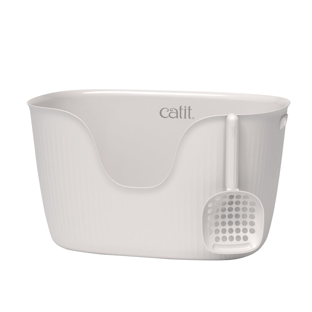 The Catit Loo litter box and scoop are crafted from 99% PCR (post-consumer recycled) plastic, helping to minimize plastic waste and supporting the reuse of materials that would otherwise end up in landfills. In addition, the litter box is BPA-free. The Catit Loo is a practical, open litter box with beautifully flowing, natural curves. Thanks to its simplicity, the Catit Loo offers cats enough room to dig, turn, and bury their business - all within a fairly compact footprint. The Loo’s entrance doesn’t dip quite as low as that of other open litter boxes, helping to prevent litter spills. The high walls are smooth on the inside, curving at the bottom to facilitate scooping and cleaning. The handles on the sides are sufficiently thick and rounded for an ergonomic grip when handling the box. The Catit Loo includes a matching scoop you can hang from the top by the handle, designed so the scooper won’t touch the box. The narrow indentation within the scoop catches small particles that would otherwise fall back in through the openings.