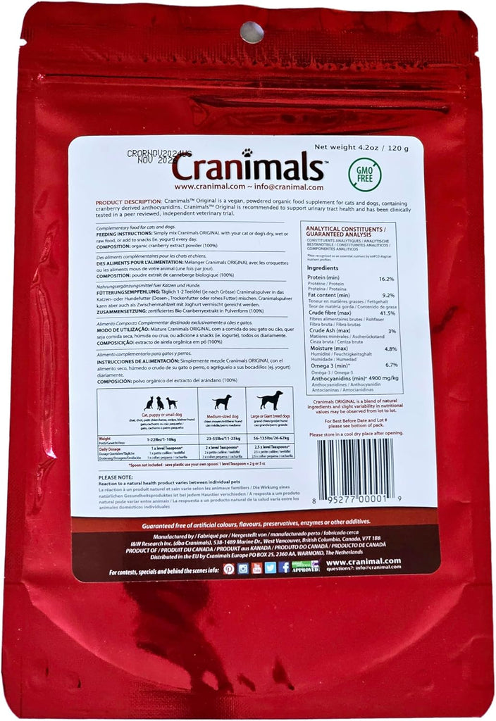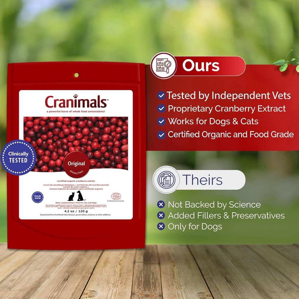 Scientifically tested in an independent peer reviewed veterinary trial. A food supplement for cats and dogs formulated with a single proprietary extract made from organic cranberries.