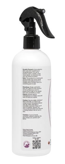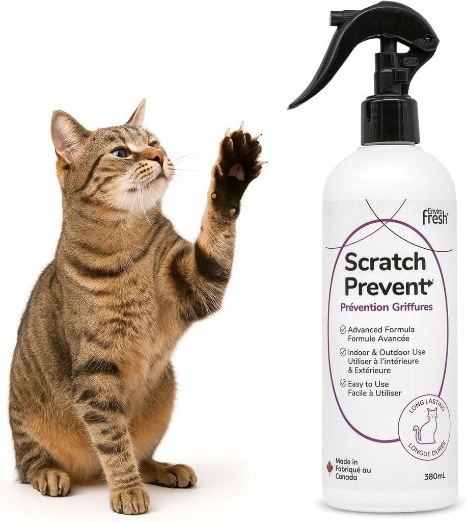Scratch Prevent is formulated to deter cats from scratching on household items. For use on furniture, doors, carpets, wood, metal, plastic, or anywhere else your cat wants to scratch.