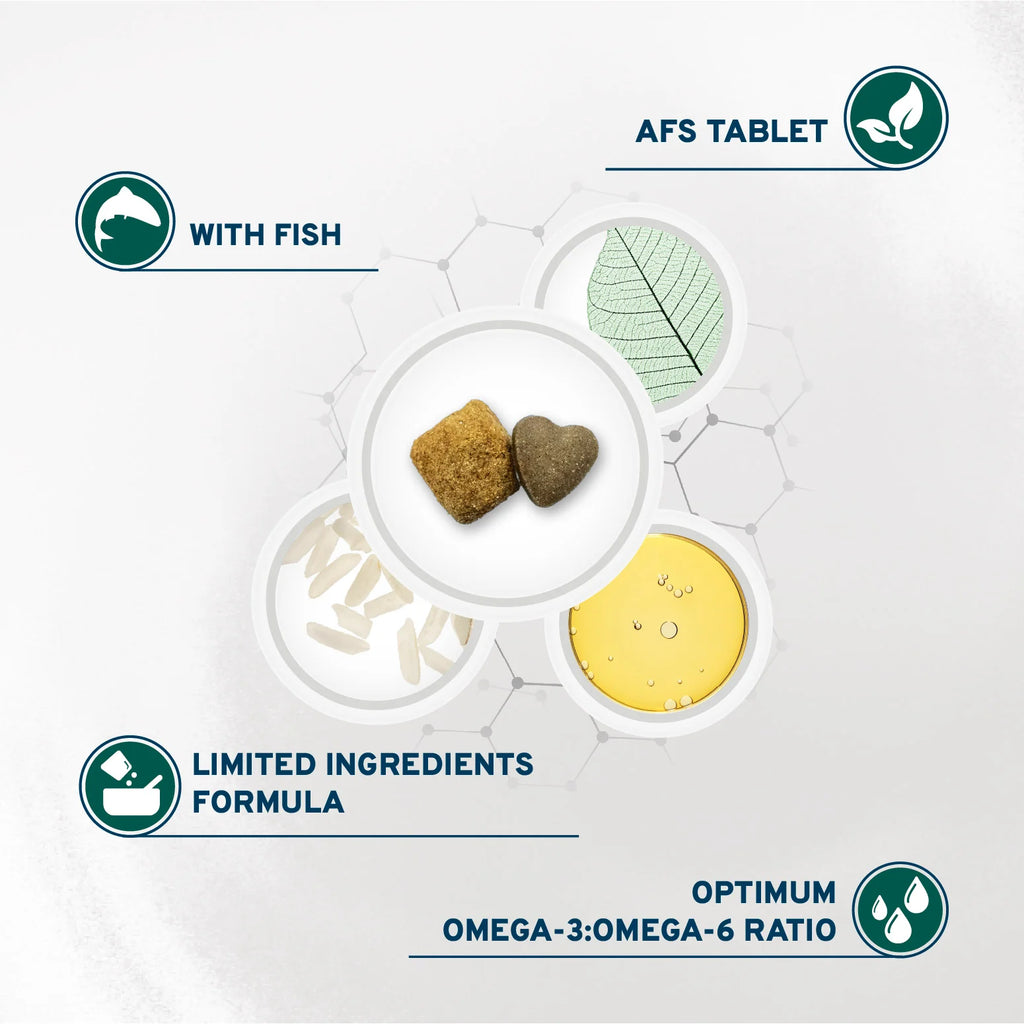 Ingredients: milled rice, dehydrated fish 19%, rice middlings, potato protein, ((AFS tablet – 7% of the food): potato protein, hydrolyzed fish protein, Rose hip 0.098%, products from the processing of vegetables (Tilia cordata 0.0147%)), fish oil 4%, sunflower oil, beet pulp, dried algae (Ascophyllum nodosum), hydrolyzed poultry protein, mannan oligosaccharides (MOS), fructo-oligosaccharides (FOS), Yucca schidigera, vitamin A, vitamin E 117 mg/kg, vitamin B1, vitamin B2, vitamin B6, vitamin B12, vitamin C, vitamin PP, calcium D-pantothenate, folic acid, choline chloride, DL-methionine, zinc sulphate monohydrate, copper(II) chelate of amino acids hydrate, clinoptilolite of sedimentary origin, tocopherol extract from vegetable oils 12.0 mg/kg, Purple coneflower (Echinacea purpurea), tea tree oil 35 mg/kg, Rosemary.