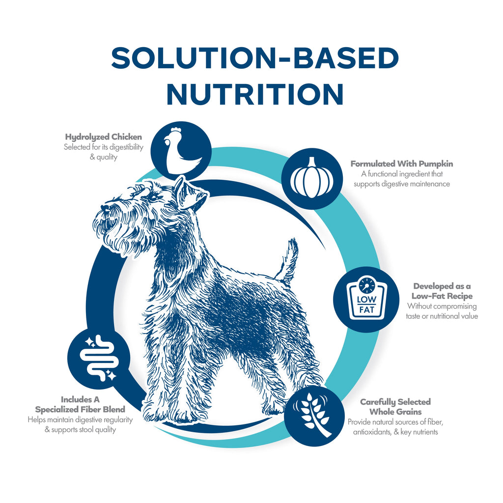 Digestive-supporting, low-fat complete adult dog food formulated with hydrolyzed proteins and a specialized fiber blend of dried beet pulp, pumpkin, ground miscanthus grass, and dried chicory root to maintain and support healthy digestion and overall gastrointestinal well-being.