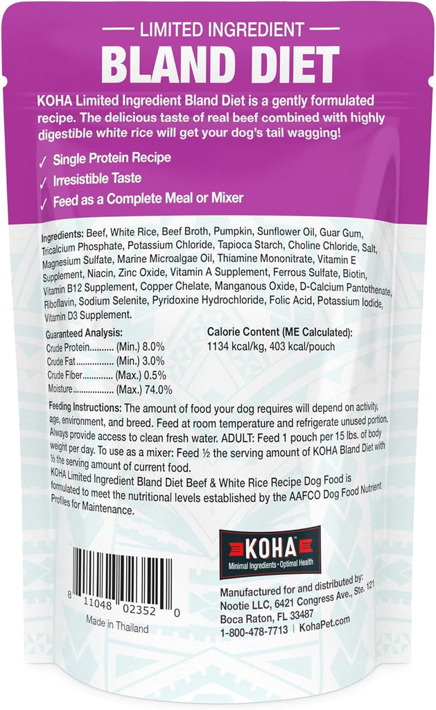 KOHA Limited Ingredient Bland Diet for Dogs - Beef & White Rice Recipe offers a special blend designed to soothe your dog's digestive troubles, such as upset stomachs, including loose stool and diarrhea. This recipe includes just beef as the sole protein source, paired with white rice and pumpkin to aid digestion and promote firm stools. It’s a ready-to-serve formula, providing convenience without the hassle of preparation, and is crafted without common allergens or fillers.