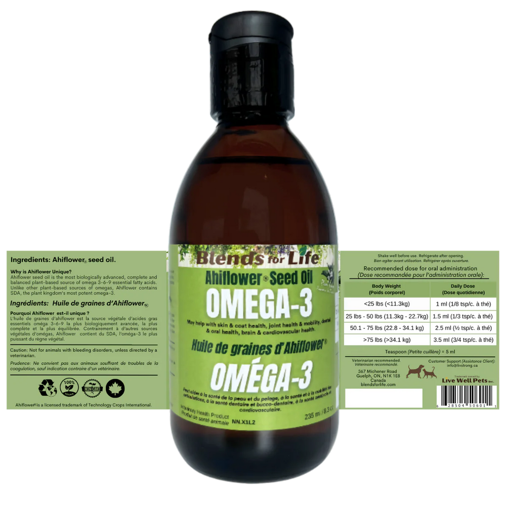 Omega-3 Ahiflower Seed Oil 225ml May help with skin & coat health, joint health & mobility, dental & oral health, brain & cardiovascular health. Omega-3 fatty acids are essential for dogs & cats, just as they are for humans. They contribute to various aspects of a dog’s & cat's health, including: Joint Health: Ahiflower oil can help maintain healthy joints, reducing the risk of arthritis and joint pain in dogs & cats. As pet owners, we are constantly seeking ways to enhance the well-being of our furry friends. One of the latest trends in pet health is Ahiflower oil, a natural supplement derived from the Ahiflower plant. This plant, native to the United Kingdom, provides a rich source of essential fatty acids, particularly Alpha-linolenic acid (ALA), a form of Omega-3 fatty acid. This natural origin of Ahiflower oil reassures us about its safety and suitability for our dogs & cats, making it a promising choice to boost their health. What Is Ahiflower Oil? Ahiflower oil is derived from the seeds of the Ahiflower plant (Buglossoides arvensis), a flowering plant native to the United Kingdom. This oil is a rich source of essential fatty acids, particularly Alpha-linolenic acid (ALA), a form of Omega-3 fatty acid. ALA plays a crucial role in dogs' overall health, making Ahiflower oil a promising supplement for our canine companions. Ahiflower oil is unique because it contains Alpha-linolenic acid (ALA) and Gamma-linolenic acid (GLA). ALA is an essential Omega-3 fatty acid, while GLA is an Omega-6 fatty acid. These two fatty acids working together can significantly impact your dog’s health. ALA helps reduce inflammation and improve brain function, while GLA is known for its anti-inflammatory and skin benefits. Many dog & cat owners are already familiar with fish oil as a source of Omega-3s.