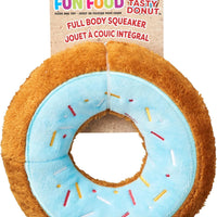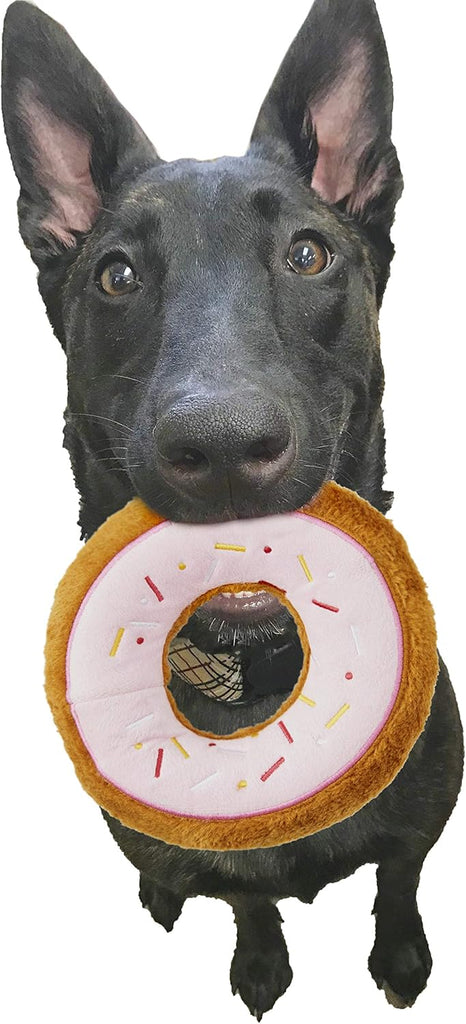 Soft plush dog toy tasty donut. Full body squeaker that squeaks even if punctured. Easy to pick up and fun to toss around.