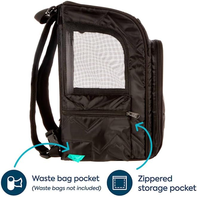 Backpack mode features a roll-open top and a safety adjustable tether to clip onto your pet's harness. This fashionable soft-sided carrier features a stability board and rods for your pet's safety and comfort, so it can easily fit under an airline seat while maintaining its structure. A built-in waste bag dispenser (waste bag sold separately), pockets, and attached carabiner ensure you can take all the travel accessories and travel documents needed for you and your furry friend. With modernized solutions, safety features, and high-quality materials, Sherpa® Air makes jet-setting with your pet effortless.