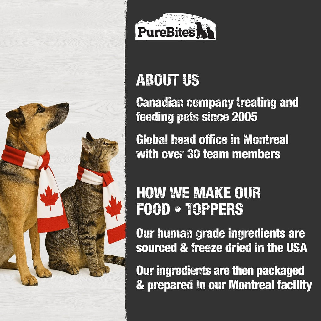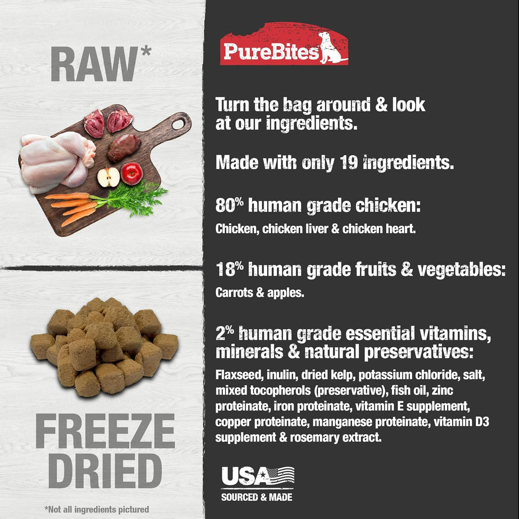 Go ahead, turn the bag around and look at our ingredients. PureBites® Chicken Recipe RAW Freeze Dried Complete & Balanced Dog food or topper is made with 19 Human Grade Ingredients. Made with 80% Human Grade Chicken, 18% Human Grade Fruit & Vegetables, & 2% Human Grade Essential Vitamins, Minerals & Natural Preservatives. PureBites® Chicken Recipe can be fed as a 100% complete & balanced dog food or as a mixer/ topper for an added RAW protein boost. Dogs love the taste of PureBites® because our food is delicately freeze dried RAW to lock in & the aroma, texture and freshness they crave. Dog parents love PureBites® because our food or topper is rich in nutrients for a happy and healthy life.