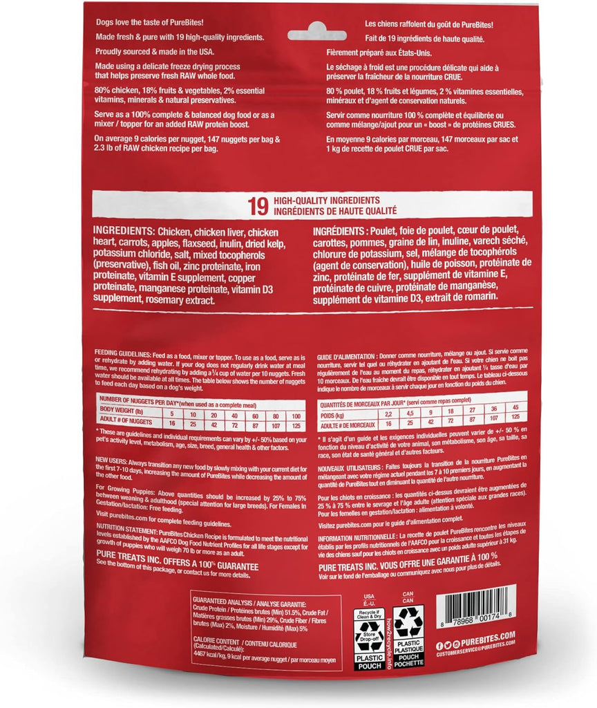 Nutrition Statement: PureBites® Chicken Recipe is formulated to meet the nutritional levels established by the AAFCO Dog Food Nutrient Profiles for all life stages except for growth of puppies who will weigh 70 lb or more as an adult.