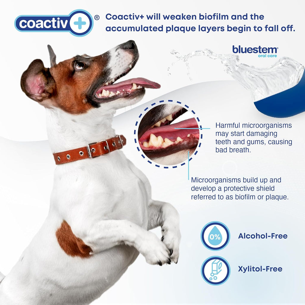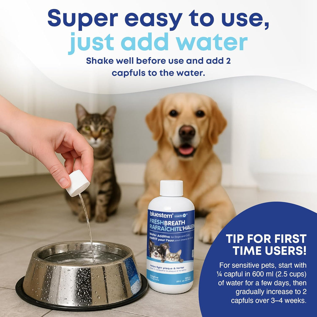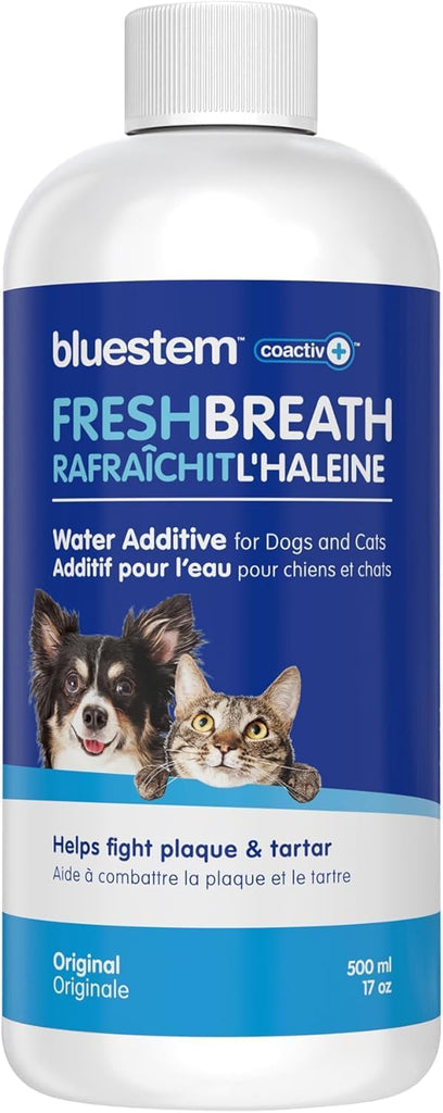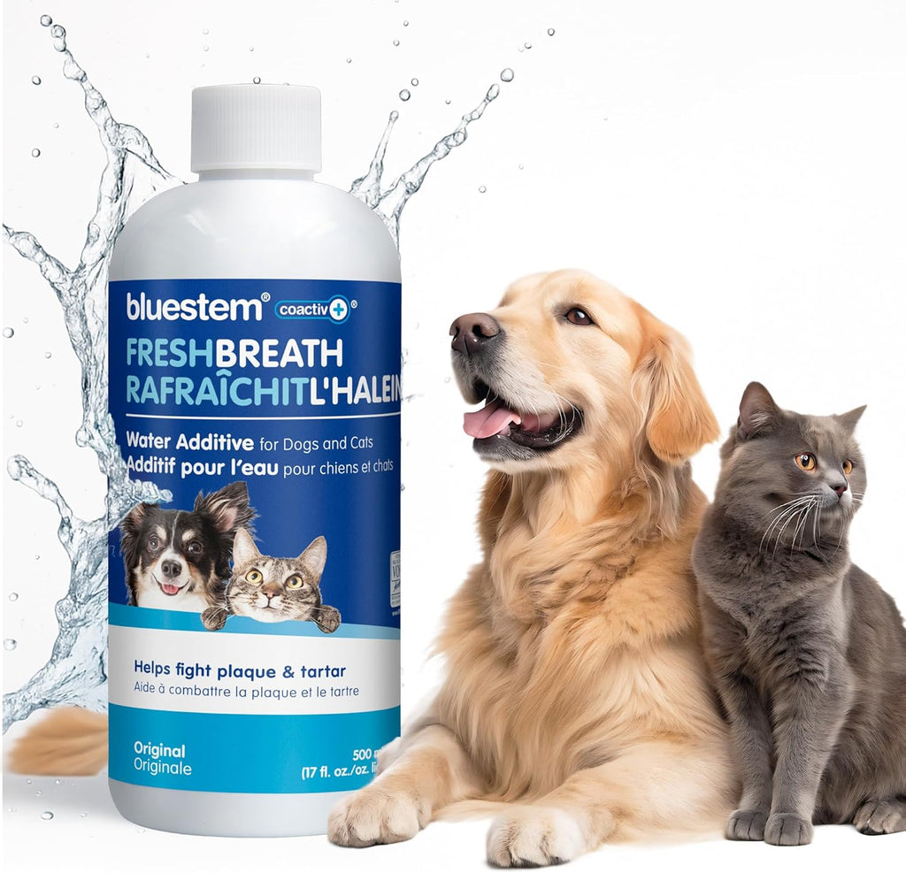 bluestem™ oral care water additive with coactiv+™ is scientifically formulated to freshen breath, fight plaque and tartar, and promote good oral hygiene. bluestem™ Original (Unflavored) is formulated for daily use for all sizes and breeds of cats and dogs.
