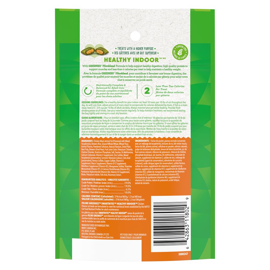 - Contains one (1) 60g (2.1oz) pouch of FELINE GREENIES SMARTBITES HEALTHY INDOOR Adult Cat Treats Chicken Flavour
