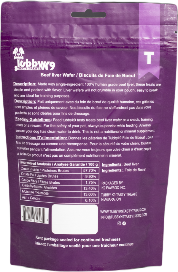 Beef Liver Wafer treats are loaded with flavour, vitamins, health benefits and more. 100% Beef Liver that is slowly baked to perfection to lock in the flavour and will leave your dog wanting more. Feel guilt free, give your dog something that is good for them, but also tastes great!