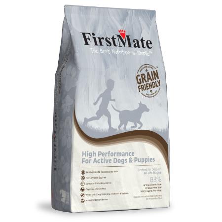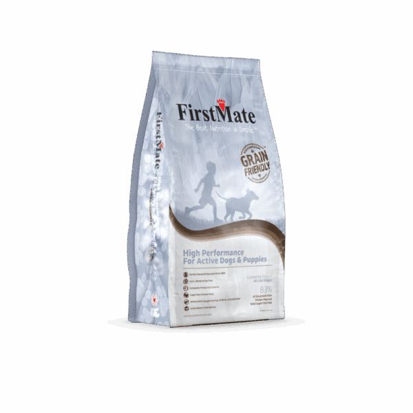 FirstMate High Performance for Active Dogs and Puppies will give your active puppy or adult dog the nutrients and caloric intake they need to stay healthy and fit. This food has optimal levels of protein and fats ensure growing dogs, nursing female dogs, and high-performance adult dogs can maintain their high energy levels. This formula's protein breakdown is a combination of 83% free-run chicken meal with wild-caught whole herring, anchovy and sardines, and 17% from digestible grains like brown rice and oatmeal. It has also been supplemented to help protect dogs' joints in the long-term.