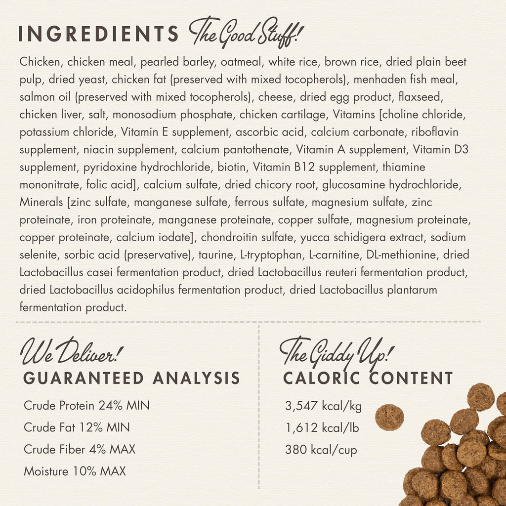 Chicken, chicken meal, pearled barley, oatmeal, white rice, brown rice, dried plain beet pulp, dried yeast, chicken fat (preserved with mixed tocopherols), menhaden fish meal, salmon oil (preserved with mixed tocopherols), cheese, dried egg product, flaxseed, chicken liver, salt, monosodium phosphate, chicken cartilage, vitamins [choline chloride, potassium chloride, Vitamin E supplement, ascorbic acid, calcium carbonate, riboflavin supplement, niacin supplement, calcium pantothenate, Vitamin A supplement, Vitamin D3 supplement, pyridoxine hydrochloride, biotin, Vitamin B12 supplement, thiamine mononitrate, folic acid], calcium sulfate, chicory root extract, glucosamine hydrochloride, minerals [zinc sulfate, manganese sulfate, ferrous sulfate, magnesium sulfate, zinc proteinate, iron proteinate, manganese proteinate, copper sulfate, magnesium proteinate, copper proteinate, calcium iodate], chondroitin sulfate, yucca schidigera extract, sodium selenite, sorbic acid (preservative), taurine, L-Tryptophan, L-Carnitine, DL-Methionine, dried lactobacillus casei fermentation product, dried lactobacillus reuteri fermentation product, dried lactobacillus acidophilus fermentation product, dried lactobacillus plantarum fermentation product.