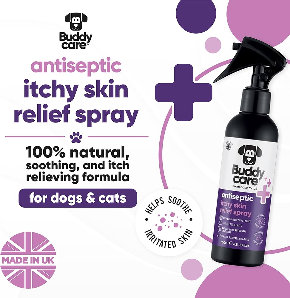 Give your furry friend the relief they deserve with Buddycare's Antiseptic Itchy Skin Relief Spray for Dogs. Our expertly formulated spray provides immediate relief from itching, hot spots, and skin irritations, promoting a healthier, happier pet.