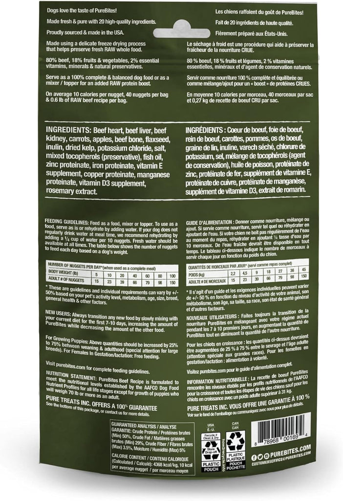 Nutrition Statement: PureBites® Beef Recipe is formulated to meet the nutritional levels established by the AAFCO Dog Food Nutrient Profiles for all life stages except for growth of puppies who will weigh 70 lb or more as an adult.
