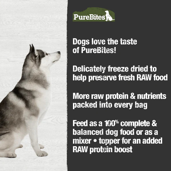 Go ahead, turn the bag around and look at our ingredients. PureBites® Beef Recipe RAW Freeze Dried Complete & Balanced Dog food or topper is made with 20 Human Grade Ingredients. Made with 80% Human Grade Beef, 18% Human Grade Fruit & Vegetables, & 2% Human Grade Essential Vitamins, Minerals & Natural Preservatives. PureBites® Beef Recipe can be fed as a 100% complete & balanced dog food or as a mixer/ topper for an added RAW protein boost. Dogs love the taste of PureBites® because our food is delicately freeze dried RAW to lock in & the aroma, texture and freshness they crave. Dog parents love PureBites® because our food or topper is rich in nutrients for a happy and healthy life.