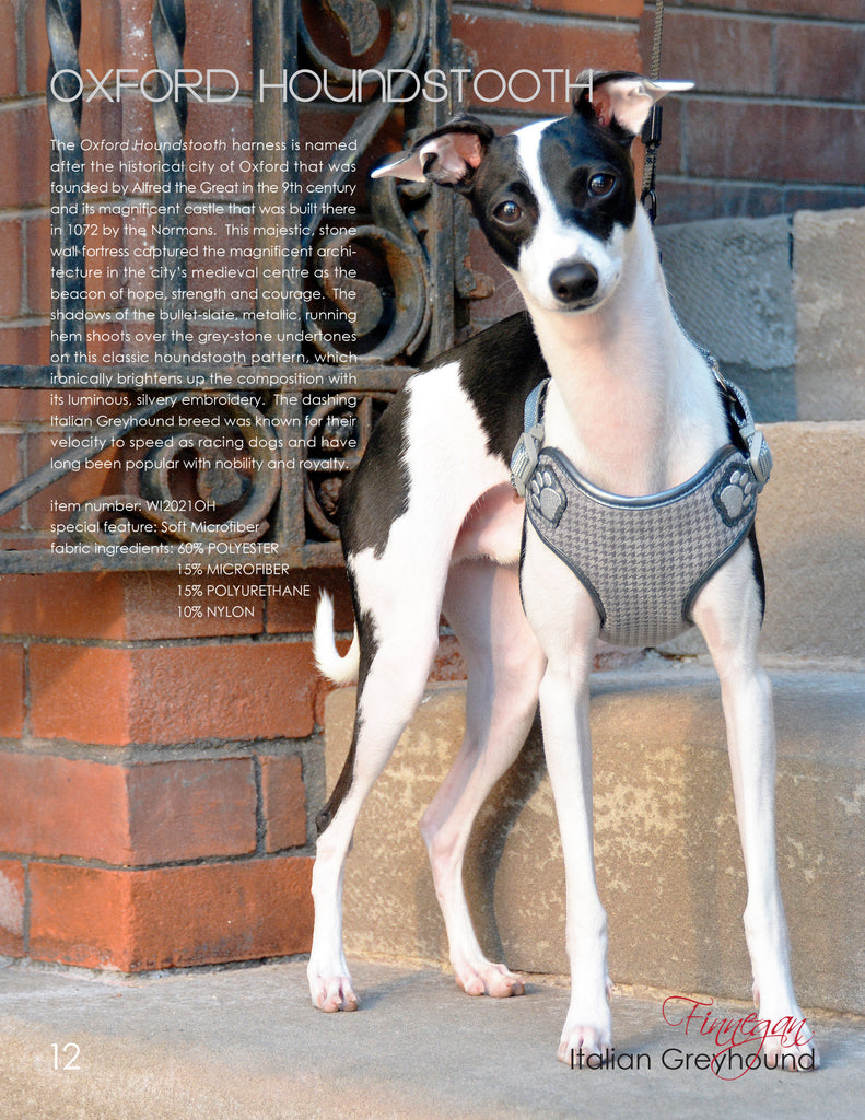 The Oxford Houndstooth harness is named after the historical city of Oxford that was founded by Alfred the Great in the 9th century and its magnificent castle that was built there in 1072 by the Normans. This majestic, stone wall fortress captured the magnificent architecture in the city’s medieval centre as the beacon of hope, strength and courage. The shadows of the bullet-slate, metallic, running hem shoots over the grey-stone undertones on this classic houndstooth pattern, which ironically brightens up the composition with its luminous, silvery embroidery. The dashing Italian Greyhound breed was known for their velocity to speed as racing dogs and have long been popular with nobility and royalty.