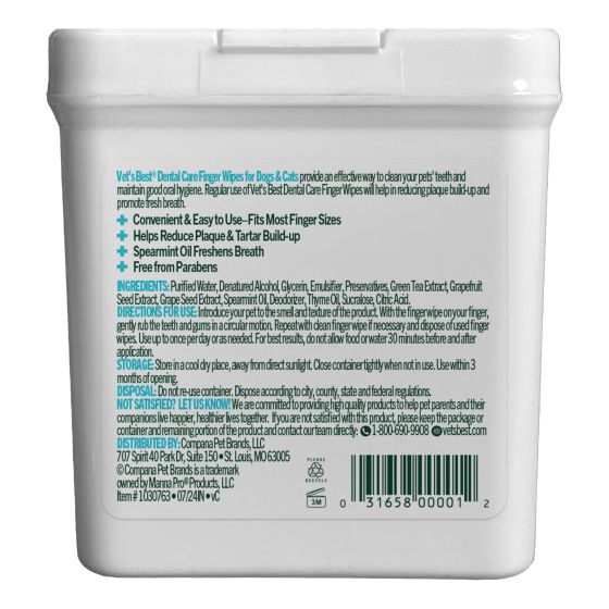 Vet's Best Dental Care Finger Wipes for Dogs & Cats provide an effective way to clean your pet’s teeth and maintain good oral hygiene. Regular use of Vet's Best Dental Care Finger Wipes will help in reducing plaque build-up and promote fresh breath. This specially designed wipe allows the pet owner to be guided by their own touch when cleaning their pet’s teeth.