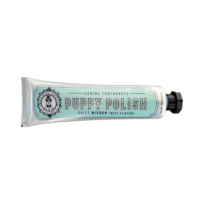 Puppy Polish Toothpaste - Filet Mignon - Beef (100g/3.5oz) is the ultimate canine oral care solution, crafted with natural ingredients for a kissable smile. Our lab-tested formula ensures fresh breath for your best friend. Featuring quality ingredients like Baking Soda, Coconut Oil & Stevia, it guarantees a delicious experience safe for dogs of all ages. It has a very subtle aroma, which humans appreciate. Free from chlorhexidine, DMDM, artificial colors, parabens, triclosan, fluoride, xylitol & heavy metals. Designed and 3rd party-tested in Canada.