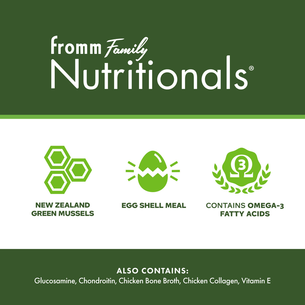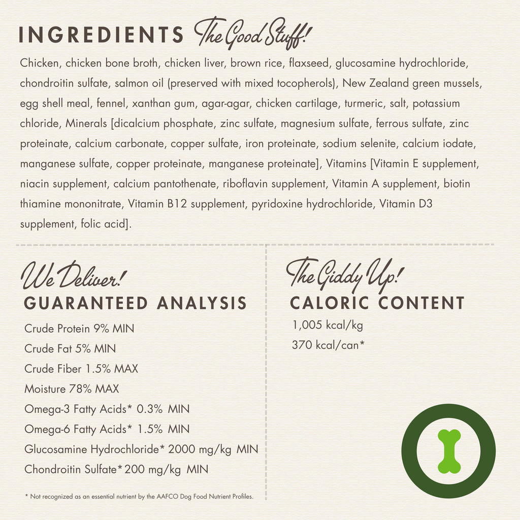 Mobility-supporting pâté containing a blend of bone broth, glucosamine, New Zealand green mussels, egg shell meal, chicken cartilage, and chondroitin to help support healthy cartilage, bones, and connective tissues.