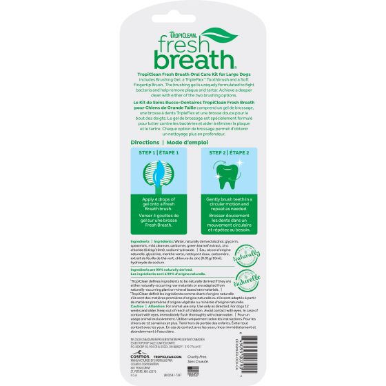 Oral care is about more than making your pets’ smiles sparkle—it’s an important component of their overall health. In fact, 80% of dogs begin to show signs of oral disease by age 3. Our TropiClean Fresh Breath Oral Care Kit for Large Dogs includes our TripleFlexTM Toothbrush, Finger Brush and our Brushing Gel for Dogs. Our Brushing Gel for Dogs is infused with a unique blend of ingredients that helps remove plaque and tartar and clings to their teeth for a superior clean. Our TripleFlex Toothbrush cleans 3x faster with its easy 360-degree bristles. Also included is our Finger Brush which allows you to gently clean helping remove plaque and tartar. Clean teeth, healthy mouth, happy dog.