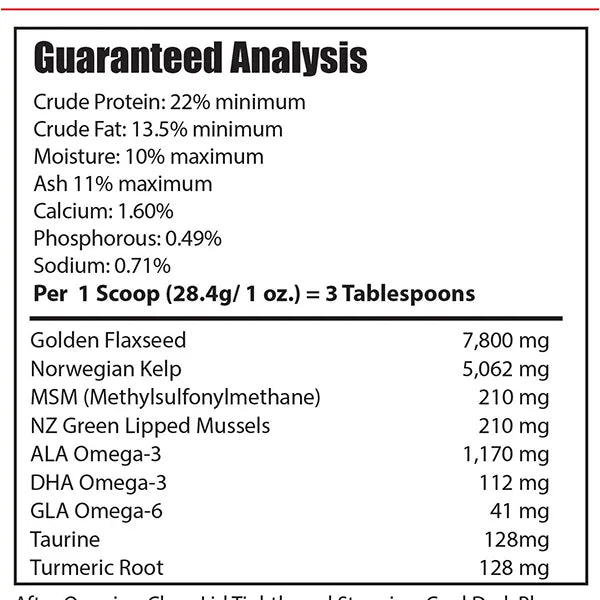 This contains overall nutrition to benefit your dog's skin and coat, and immunity boosting ingredients as well. Providing natural vitamins, minerals, amino acids, digestive enzymes, prebiotics, probiotics, essential omega-3 fatty acids; also contains Atlantic sea kelp, ground full-fat golden flaxseed, nutritional yeast culture (NOT BREWERS YEAST), and bee pollen.