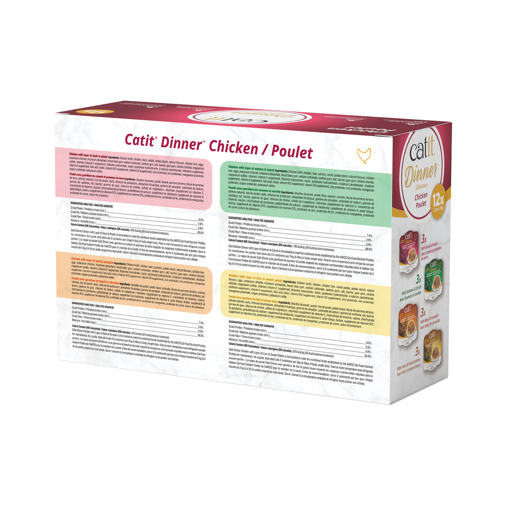 Catit Dinner is a dual-layered wet food that is made of the finest fresh ingredients! Served in luscious gravy, this premium-quality cat food is natural, high in protein and grain-free, with added vitamins and minerals for complete nutrition. Catit Dinner offers a wide array of flavors to please even the pickiest cats. Each of the 8 varieties is a unique experience for your cat’s enjoyment, and there are plenty of options for those who prefer either fish or chicken. Catit Dinner is highly palatable and combines two different textures that your cat will love. Cats are most active during dawn and dusk, so Catit Dinner is the perfect evening meal to support their energy needs, helping them settle in for a restful night’s sleep — leaving you with a content companion and some quiet time to enjoy. Great news, Catit Dinner is now available in two convenient multipacks! Tender chicken and irresistible fish. This offers your cat a delightful mealtime experience and is the perfect choice for picky eaters!