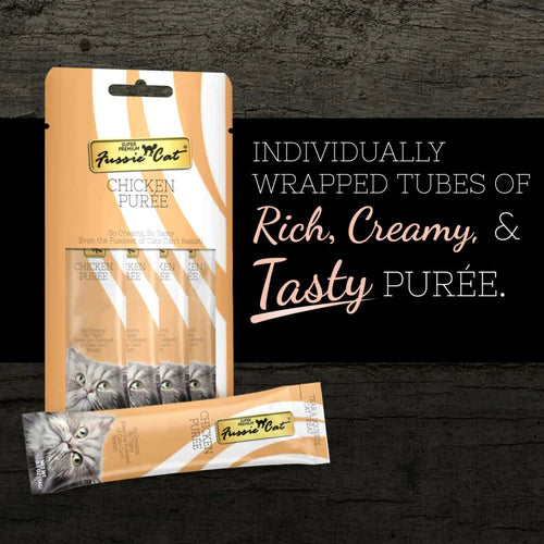 Fussie Cat Chicken Purée is love at first lick. Creamy in texture and rich in taste, this indulgent, flavorsome puree will make even the Fussiest of Cats demand more! Fussie Cat Chicken Purée is an easy-to-feed cat treat with essential vitamin E for your cat’s diet to support healthy skin and coat.