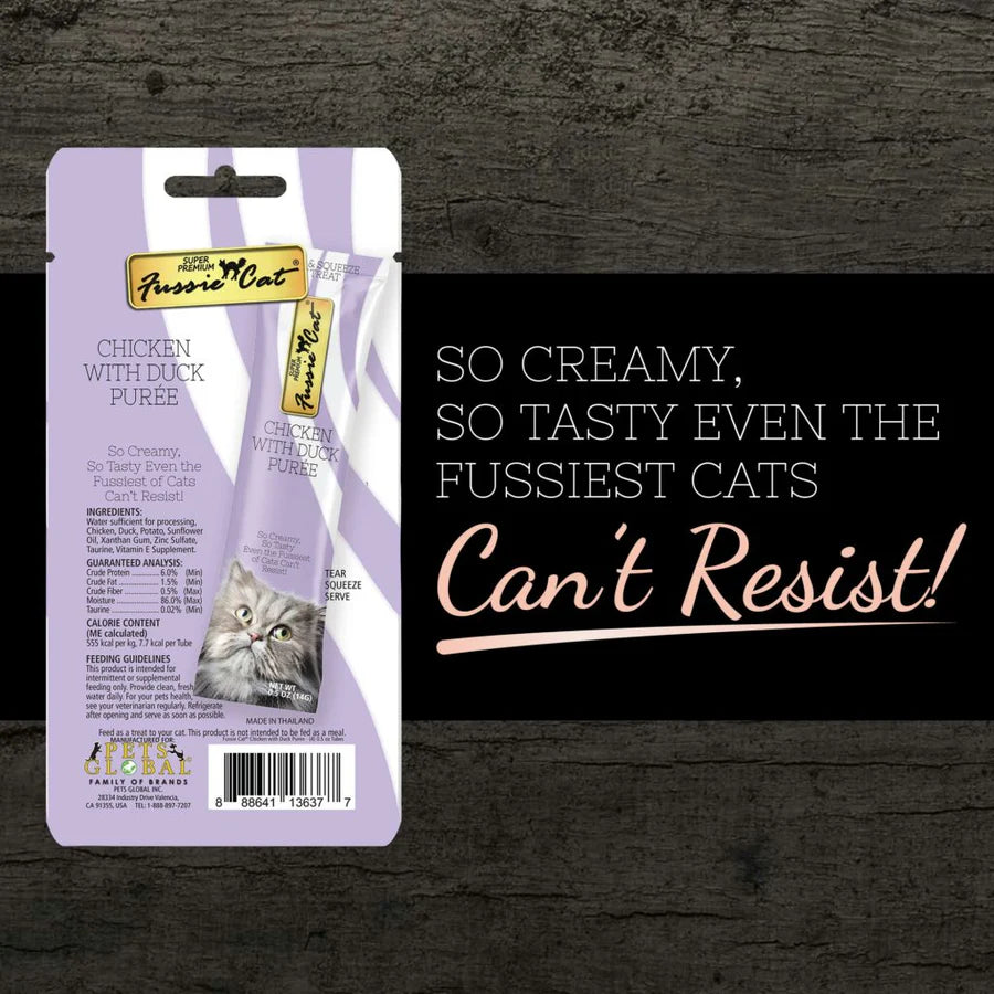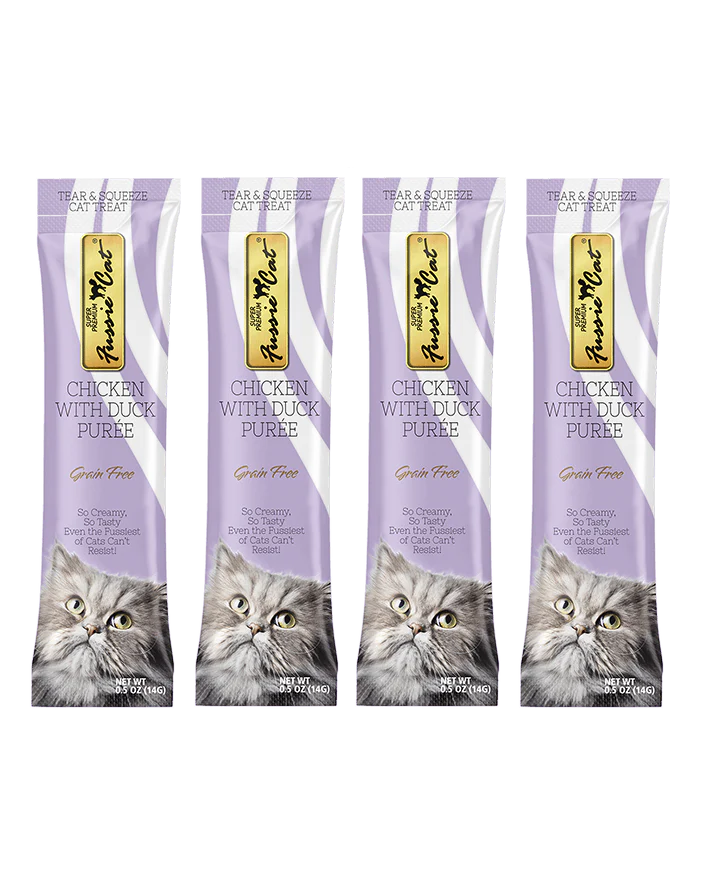 Fussie Cat's Chicken with Duck Puree cat treats are the purrr-fect way to show your furry friend some love! The treat pack comes with four individually-wrapped tubes, which are filled with a creamy and tasty puree, making them paw-fectly irresistible!