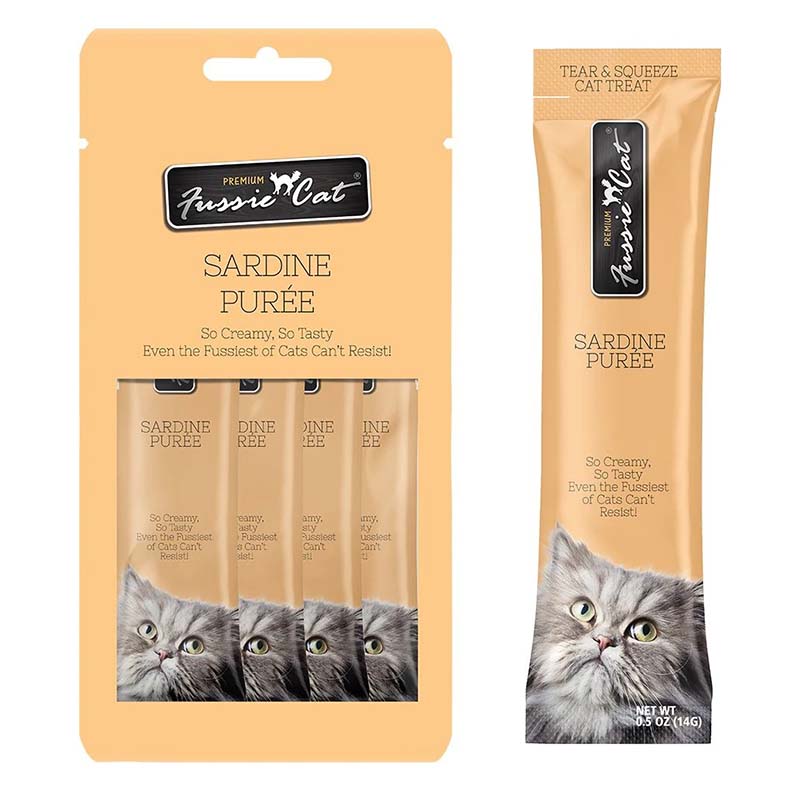 Fussie Cat Sardine Purée is love at first lick. Creamy in texture and rich in taste, this indulgent, flavorsome puree will make even the Fussiest of Cats demand more! Fussie Cat Sardine is an easy-to-feed cat treat with essential vitamin E for your cat’s diet to support healthy skin and coat.