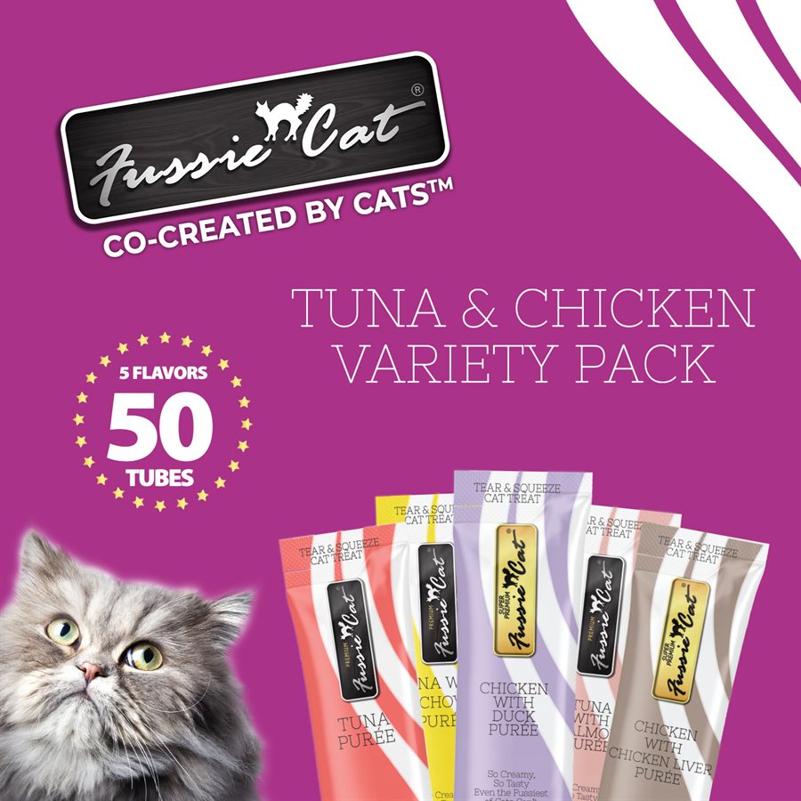Fussie Cat Tuna & Chicken Puree Variety Pack 5 Flavors 50 Count Tub