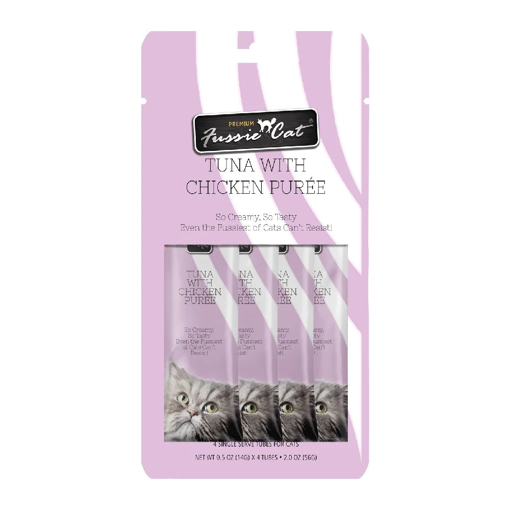 Fussie Cat Tuna with Chicken Purée is love at first lick. Creamy in texture and rich in taste, this indulgent, flavorsome puree will make even the Fussiest of Cats demand more! Fussie Cat Tuna with Chicken Purée is an easy-to-feed cat treat with essential vitamin E for your cat’s diet to support healthy skin and coat.