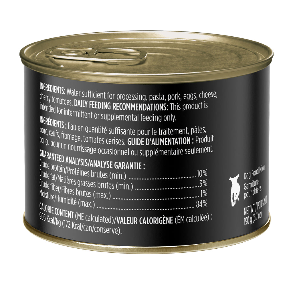 Turn every mealtime into an authentic Italian dining experience with Nutrience Trattoria Gourmet Pasta Carbonara Dog Food Topper. Made in Italy with fresh, locally sourced ingredients, each recipe is crafted with love and tradition—no preservatives, artificial colours, or flavours, just 100% Italian goodness. With real, wholesome ingredients like pork, eggs, pasta, cheese, cherry tomatoes, and water—nothing more! Simply mix it with kibble to boost hydration and flavour or serve it on a lick mat for a fun, engaging treat. Experience the true taste of Italy with every bite – indulge your dog in Pasta Carbonara and let them savour the flavours of amore!