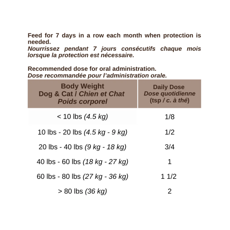 | Body Weight Dog & Cat lbs | Body Weight Dog & Cat kgs | Daily Dose (tsp) |