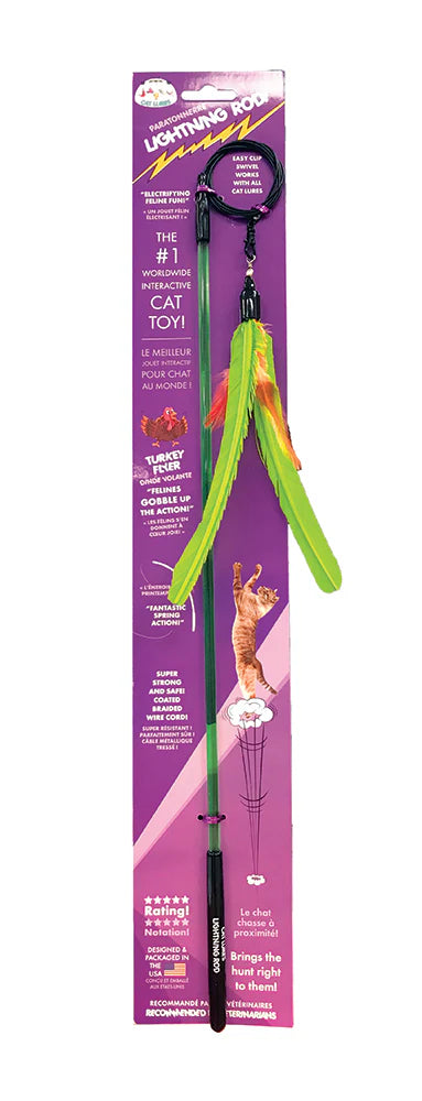 - The 19 inch Lightning Rod features a strong, coated 2 foot cord for perfect "prey catch" play. The savvy easy clip makes it a breeze switching your Lures and Feather Toys!