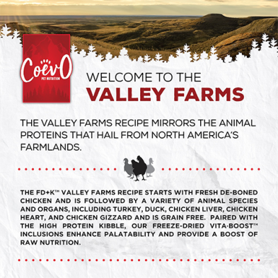 The Valley Farms FD+K™ recipe mirrors the animal proteins that hail from North America's farmlands. We pair our Evolutionary Fit™ kibble that starts with chicken, turkey, and duck with our signature Vita•Boost™ freeze-dried inclusions to provide a boost of raw nutrition and flavor.