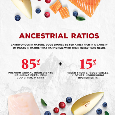 85% premium animal ingredients, including fresh fish, cod liver, and eggs + 15% fresh fruits, vegetables, and other nourishing ingredients that increase digestibility, enhance aroma, and heighten flavor so the bowl is always empty.