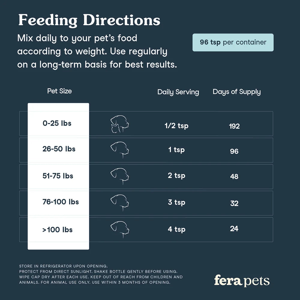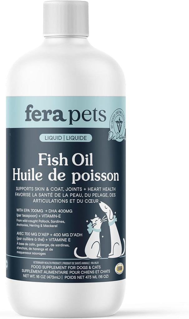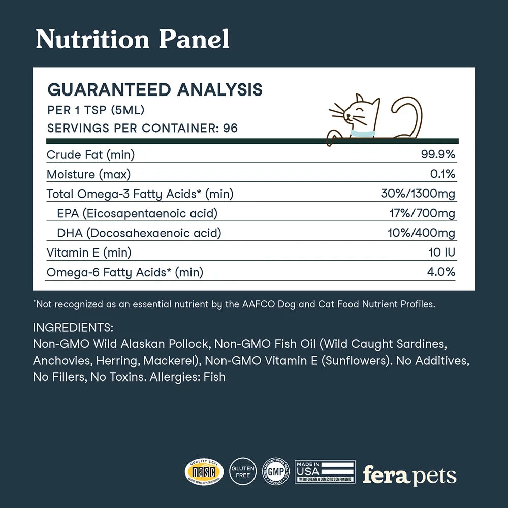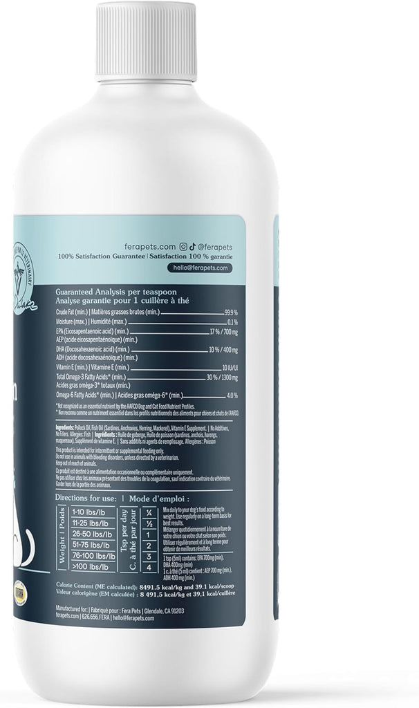 Fera's Fish Oil contains high amounts of EPA and DHA Omega-3 essential fatty acids per teaspoon compared to other leading brands, making it the go-to fish oil for your pet. No additives, no fillers and no toxins!