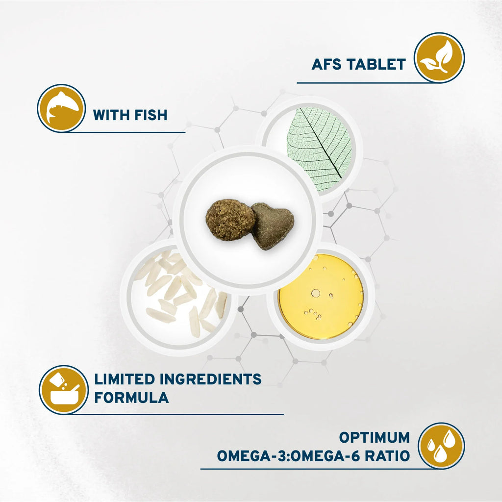 Milled rice, oils and fats (of which fish oil 2%), potato protein, hydrolyzed fish protein, ((AFS tablet – 7% of the food): potato protein, hydrolyzed fish protein, mouse-ear hawkweed, products from the processing of herbs (Lespedeza spp.), products and co-products from the processing of fresh fruits and vegetables (Vaccinium macrocarpon)), dehydrated fish, hydrolyzed poultry protein, beet pulp, dried algae (Ascophyllum nodosum), mannan oligosaccharides (MOS), fructo-oligosaccharides (FOS), Yucca schidigera, vitamin A, vitamin E, vitamin B1, vitamin B2, vitamin B6, vitamin B12, vitamin PP, calcium D-pantothenate, folic acid, choline chloride, ferrous sulphate monohydrate, zinc sulphate monohydrate, zinc chelate of amino acids hydrate, copper(II) chelate of amino acids hydrate, copper(II) sulphate pentahydrate, manganese oxide, sodium selenite, DL-methionine, taurine, clinoptilolite of sedimentary origin, tocopherol extract from vegetable oils, Common Nettle (Urtica dioica), Dandelion, Rosemary.