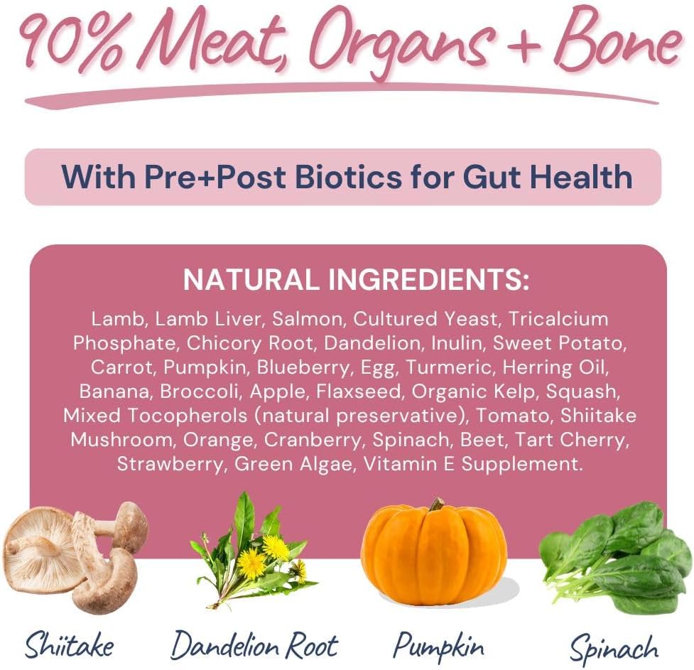 Lamb, Lamb Liver, Salmon, Cultured Yeast, Inulin, Chicory Root, Dandelion, Carrots, Pumpkin, Apples, Broccoli, Blueberry, Flaxseed, Banana, Squash, Parsley, Egg, Organic Kelp, Herring Oil, Turmeric, Mixed Tocopherols (natural preservative), Tomato, Shiitake Mushroom, Orange, Cranberry, Spinach, Beet, Tart Cherry, Strawberry, Vitamin E Supplement.