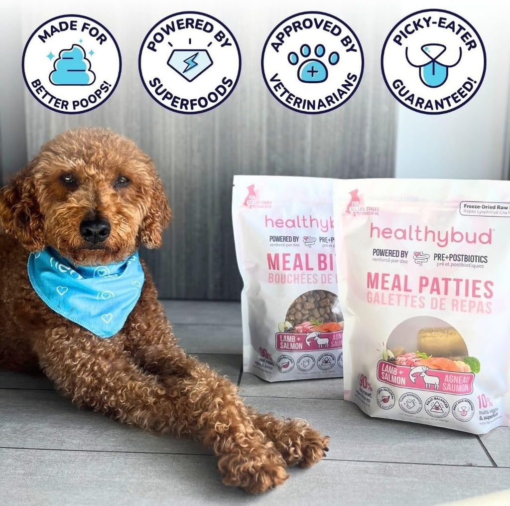 A complete & balanced rehydratable freeze-dried meal with superfoods. Made for the pickiest of eaters! Healthybud’s easy to serve, rehydratable freeze-dried lamb & salmon patties provide the powerful benefits of raw food with the convenience of kibble. Packed with delicious & nutritious ingredients, this product was crafted with the pickiest eaters in mind to help your dog thrive from the inside out. Made with 85% organ, meat & bones and 15% fruits, vegetables & superfoods. Formulated to exceed the nutritional levels established by the AAFCO Dog Food Nutrient Profiles for All Life Stages