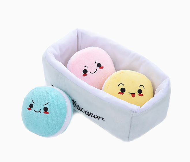 Bring some French flair to your dog’s playtime. This macaron pack comes with three of the classic French cookies. Each macaron is packed with soft filling and a satisfying squeaker that’s sure to delight. Take the macaron out of the crinkly box for a sweet snack time!