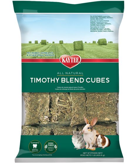 Kaytee Timothy Hay Blend Cubes are compressed blocks of nutritious sun-cured timothy hay and sun-cured alfalfa hay that are ideal as a natural treat and a highly fiber source that complements any Kaytee fortified food. Timothy Cubes are great for your small animal.