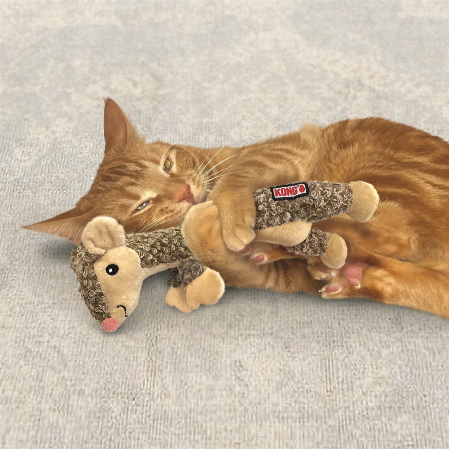 KONG Cat Luvs Mouse is ready for rounds of active play with your cat! This oversized cat toy is ideal for full-body play sessions, with uniquely textured outer material and an inner crackle that sparks wrestling and hind paw kicking. Easy-to-capture features like its head, feet, and tail make this mouse an ideal contender. KONG Premium North American Catnip inside keeps cats coming back for energetic rounds of solo play. When your cat is tired from all the action, the Luvs Mouse becomes the perfect snuggle
